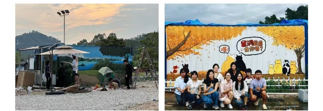 華南農(nóng)業(yè)大學(xué)藝術(shù)學(xué)院“留光筑夢,洞見未來”突擊隊以越王山丹霞地貌和客家文化為靈感,創(chuàng)作兩大主題集裝箱彩繪。“越王山主題”以巍峨山形為幕,將層巒疊嶂、赤壁奇峰繪于箱體,再現(xiàn)“以山為幕,繪山于箱”的壯美畫卷;“留洞能留住你喵”則用金秋落葉與萌趣貓咪傳遞鄉(xiāng)村溫情,吸引村民和游客駐足合影,成為留洞村文旅新名片。